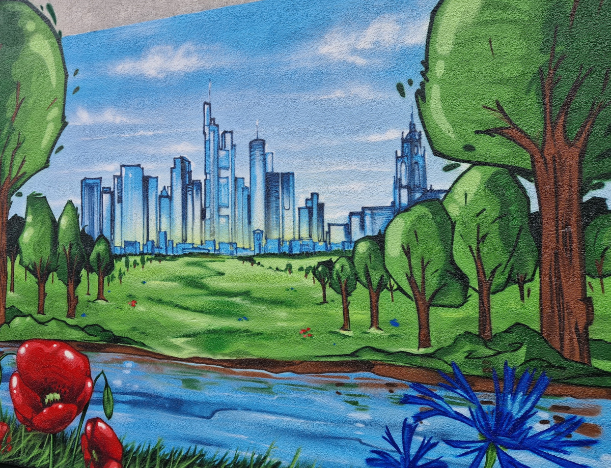 Das Ergebnis kann sich sehen lassen: Neben der Frankfurter Skyline und dem Main findet sich auch das Bornheimer Uhrtürmchen wieder – ein schönes Zeichen der Verbundenheit mit dem Stadtteil. So zeigt sich das Haus nun auch nach außen als lebendiger, bunter und vielfältiger Ort.